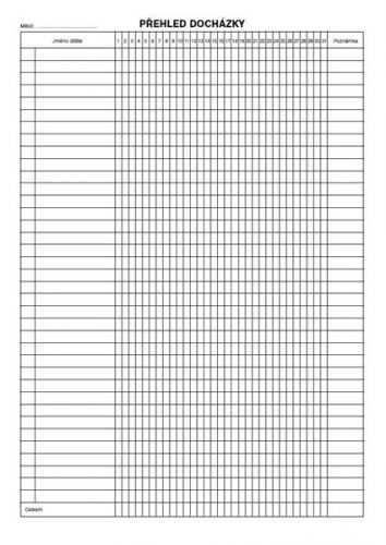 Přehled docházky - dvoulist A4 od oblíbené společnosti - tento artikl je v tento okamžik za výhodnou cenu 5 Kč. Naše výhodné nabídky čekají právě na vás. Vy neplatíte nic navíc!